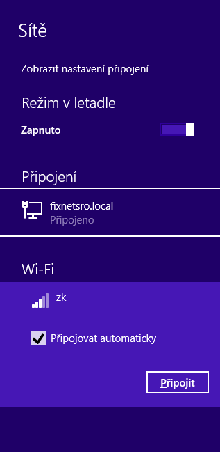 Otevře se vám nabídka připojení. U připojení k síti FIXNET zvolte Připojit.